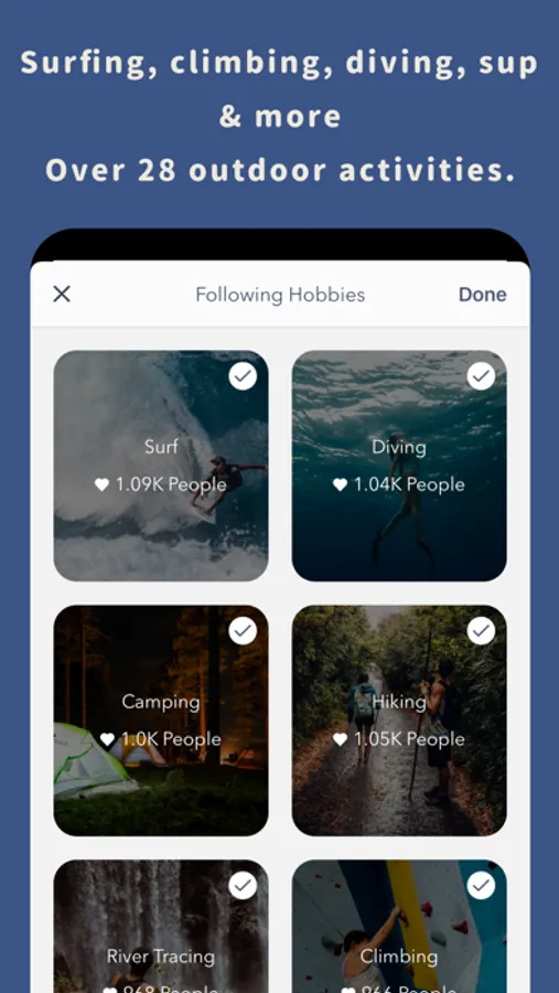 - Surfing, hiking, diving, SUP, skiing, river-tracing, camping, yoga, skateboarding and more, over than 28 activities.