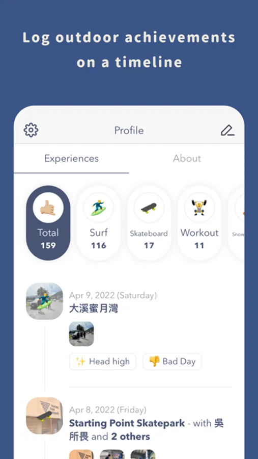 - Log achievements: over 100 outdoor achievements, speed-climbing, 1st time surfing, dive 10m, etc., record your outdoor timeline.