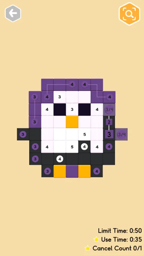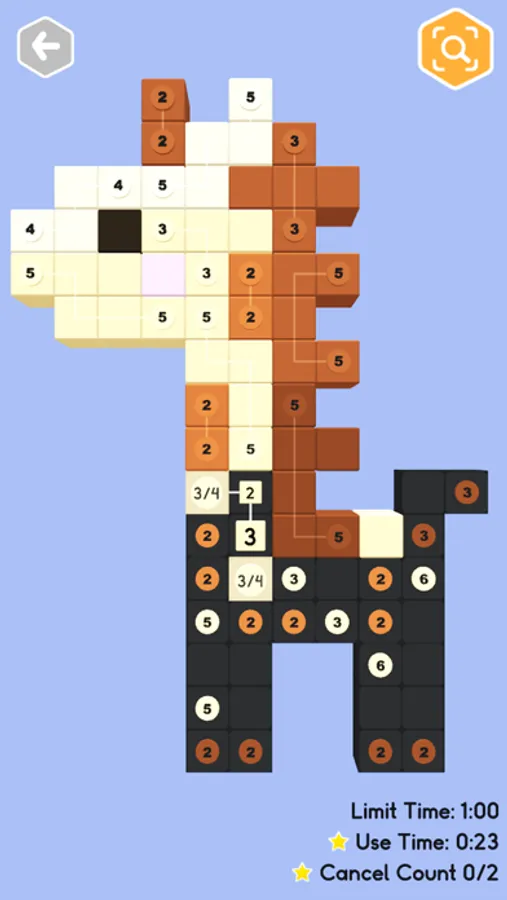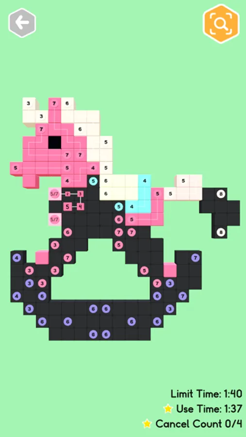Solving the puzzle by connecting squares with the same colour and number to unlock the original pixel art.
