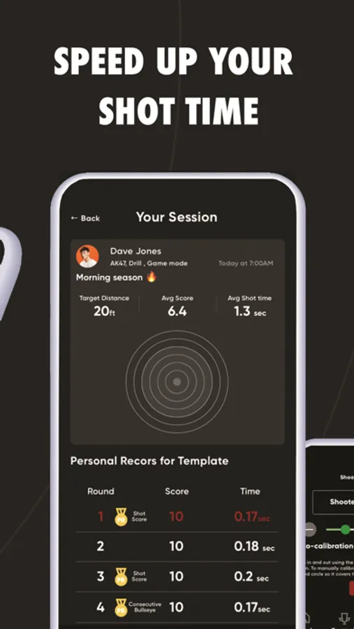 The training section is the initial area of the app where the user can practice their shooting skills. Upon beginning a session, a warning screen is shown to ensure that proper firearm safety is taking place before beginning a session. Once the user agrees, the target appears on the screen. The user calibrates the screen to the target by using two fingers to cover the circumference of the target. Then, the distance from the target is selected and they can begin shooting. Each shot from the firearm triggers a laser, which emits a laser strike on the target, and the app records the score. Shooting metrics appear on the screen to show the user how they are doing during the session. This is accompanied by audio. Once the session is complete, all shots will be shown on the target and saved into an archive.