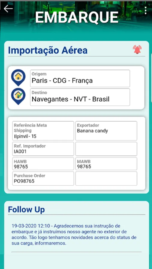 Receba notificações sobre os eventos dos seus embarques em tempo real. Interaja com o Agente de Carga por mensagens instantâneas, envie documentos, consulte taxas cambias e receba a fatura do serviço diretamente em seu celular.