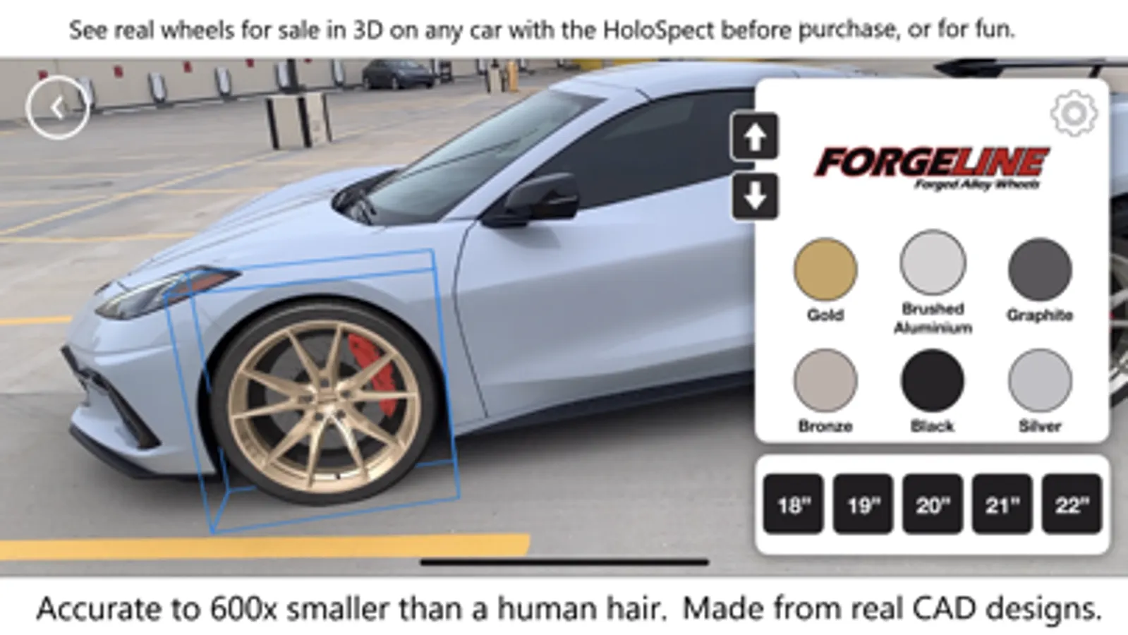 The "HoloSpect" wheel catalog allows users to see wheels on their own car in their driveway or anywhere else. The HoloSpect technology enables photo-realistic 3D holographic overlays of real wheels to be placed on any real car in real life. You can also explore the wheels in your living room. It uses the actual CAD files of the wheels. Visit www.aerolarri.com to buy any of these actual wheels for your car! The HoloSpect is not a complete replacement for wheel fitment and the colors are not perfectly accurate.