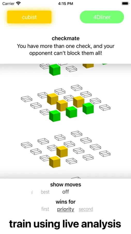 Learn to play 3D tic tac toe! Qubic lets you play online versus real opponents, or train against hundreds of unique bots. Build knowledge from each game using analysis that generates live as you play. Then put yourself to the test in timed games!