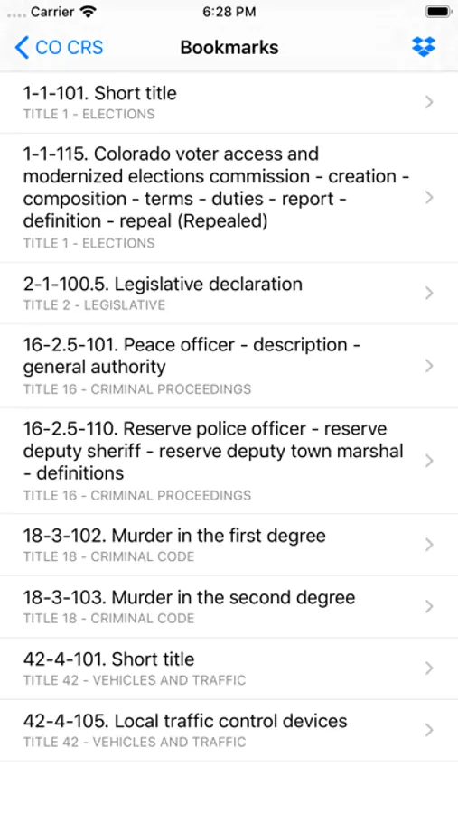 • Bookmark specific statutes for super-quick one-click direct access to those statutes you reference a lot, or those that you just can't remember which title they fall under. Upload all your Bookmarks to Dropbox to keep all your devices synchronized.