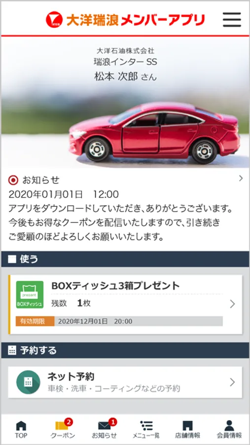 当社の公式アプリ「大洋石油(株)瑞浪インターSSメンバーアプリ」ではアプリで簡単に洗車・コーティングなどのご予約や愛車のメンテナンス管理が可能の他、当店で利用いただけるお得なクーポンや各種メニューの割引情報を配信しております。