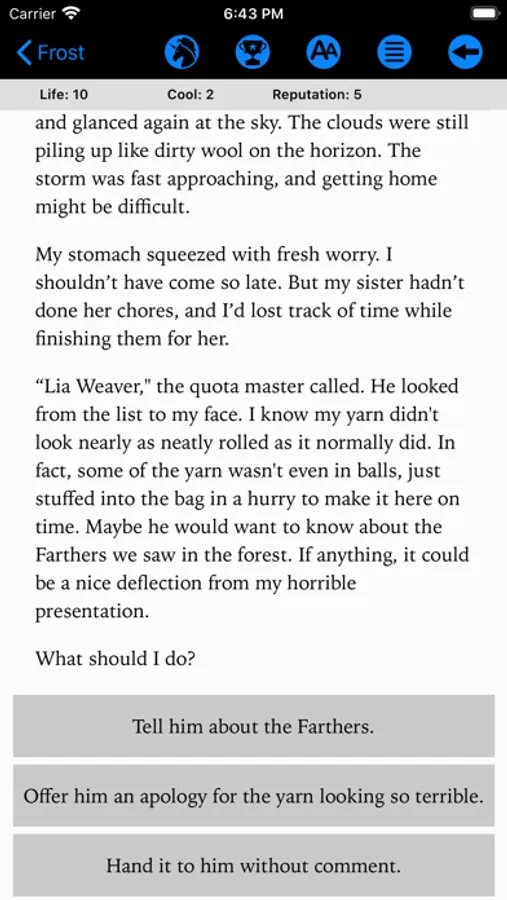 You play Lia Weaver, a young woman orphaned by the Watchers, who is now the head of her family. It's up to Lia to look after her brother and sister, no easy task in the Frost, especially living out in the forest where the Watchers are. If this weren't enough, it's not long before Lia finds herself entangled with a young man from another world. That's when the the real mystery and danger begins!