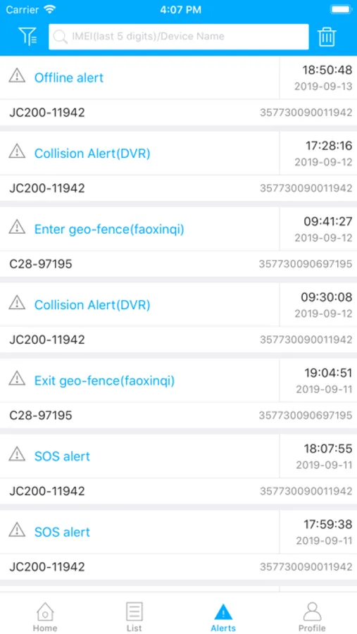 6.通報訊息 – 以車輛狀況分類顯示戶口內車輛的即時狀態,如:開關引擎,閒置,斷線或無GPS訊號等等
