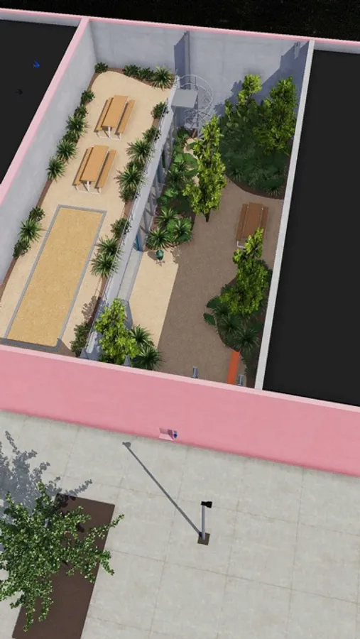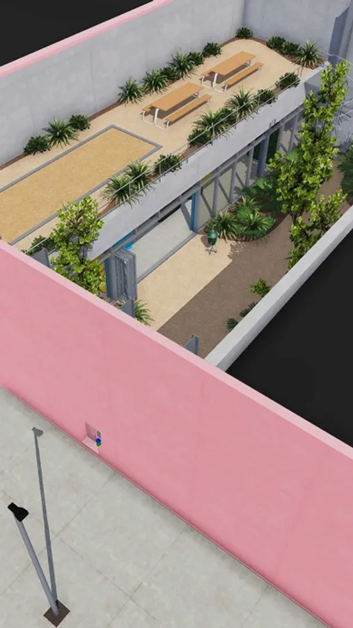 The Pink Building only has one entrance: a tiny door that gives access to a small oasis with lots of greenery, natural light and colorful details. You imagine yourself being on a total different planet; shut off from the outside world with jungle sounds coming from every corner.