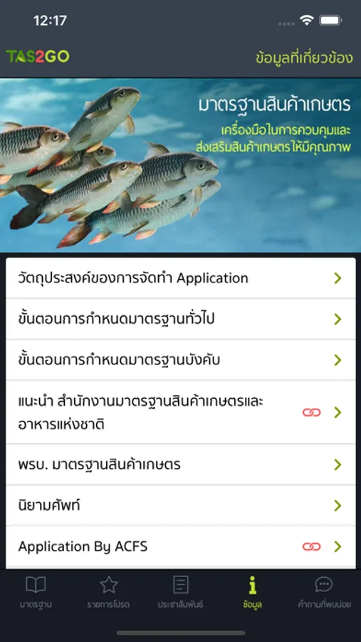 สำนักงานมาตรฐานสินค้าเกษตรและอาหารแห่งชาติ (มกอช.) ได้จัดทำแอพพลิเคชั่น TAS2GO เพื่อรวบรวมข้อมูลมาตรฐานสินค้าเกษตร และเผยแพร่ประชาสัมพันธ์ผ่านสื่อออนไลน์แก่หน่วยงานภาครัฐ ภาคเอกชน ผู้ผลิต ผู้ประกอบการ สถาบันการศึกษา และผู้บริโภค เพื่อให้สามารถเข้าถึงมาตรฐานสินค้าเกษตรได้ สะดวก รวดเร็ว และมีประสิทธิภาพมากยิ่งขึ้น