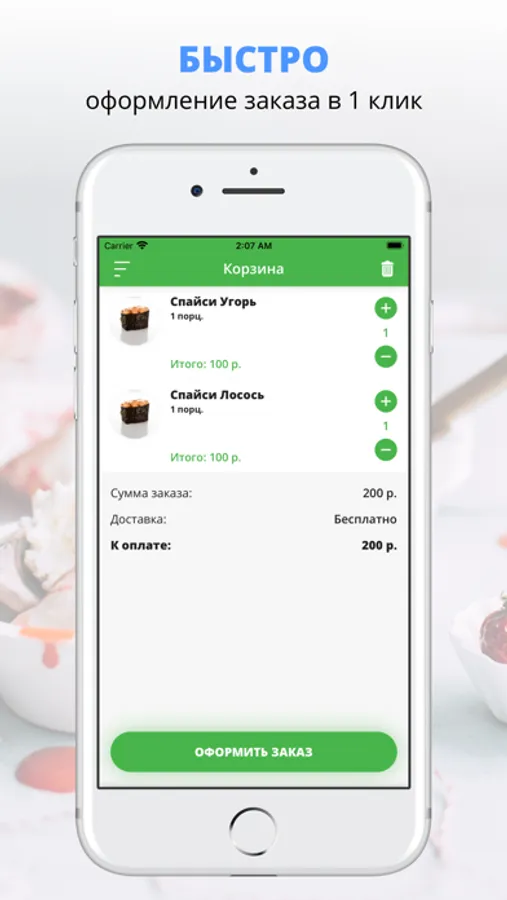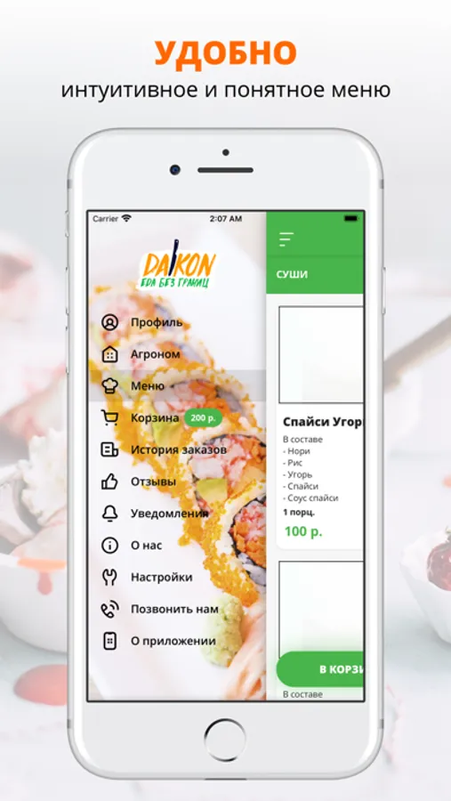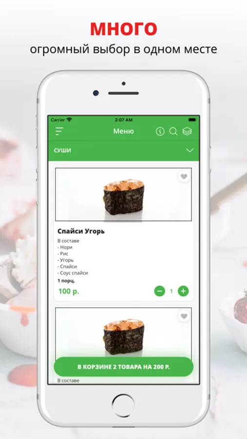 - Разнообразное меню роллов, суши, лапши WOK и напитков.