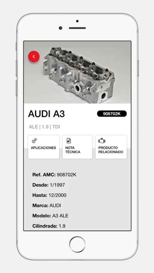 El buscador de la app te ofrecerá aquellas culatas que sean compatibles con tu vehículo, pudiendo acceder a una completa ficha informativa con las características técnicas de la pieza, referencia, aplicaciones, nota técnica y productos relacionados. También puedes escanear el código QR y código de barras desde la propia app.