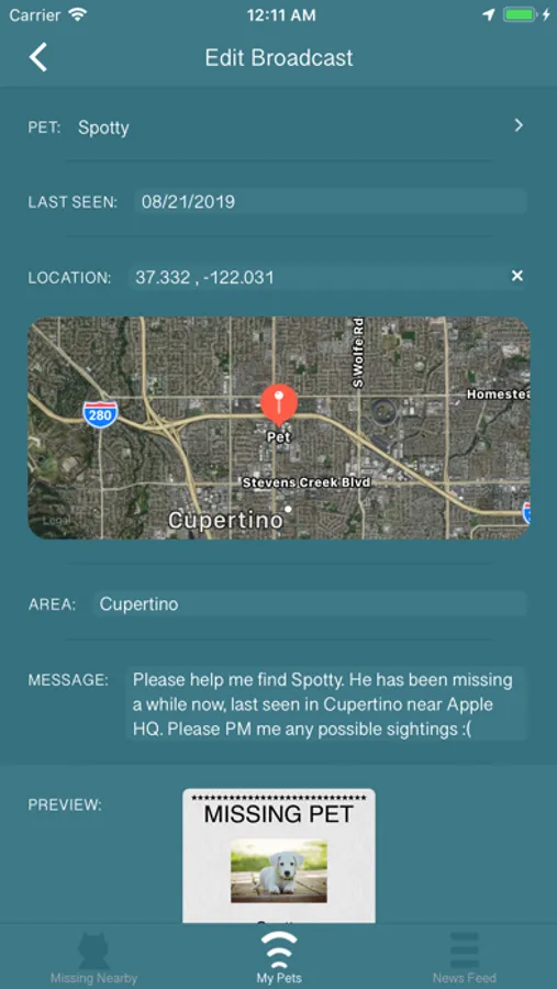 Should your pet go missing, everyone within your local area that has the app, will receive a notification within minutes of you reporting them missing.