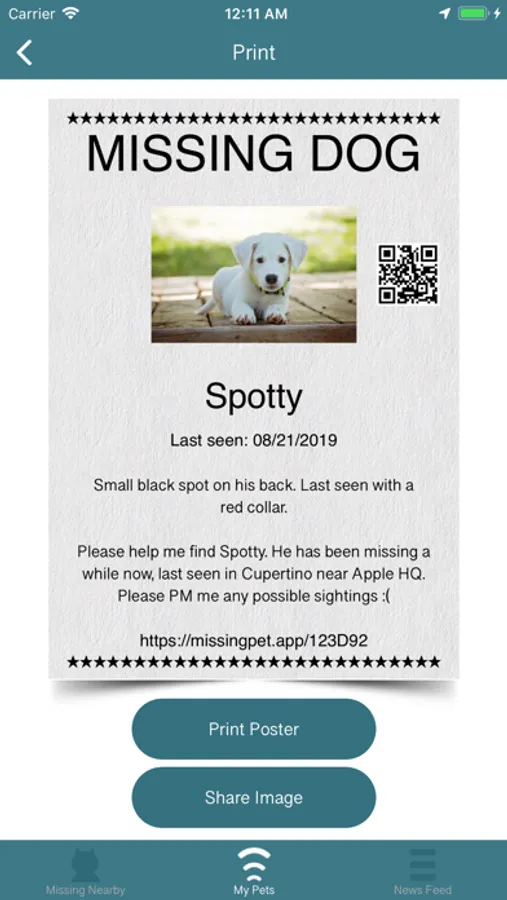 Pet owners can instantly print out posters with QR codes and easily share them with other social media platforms.