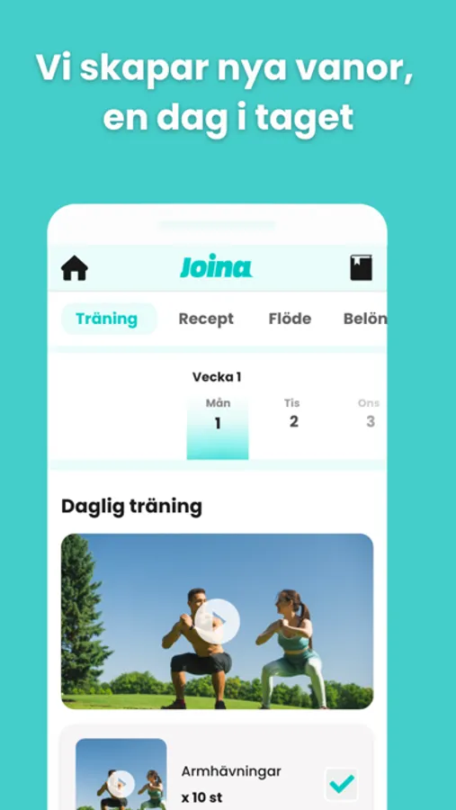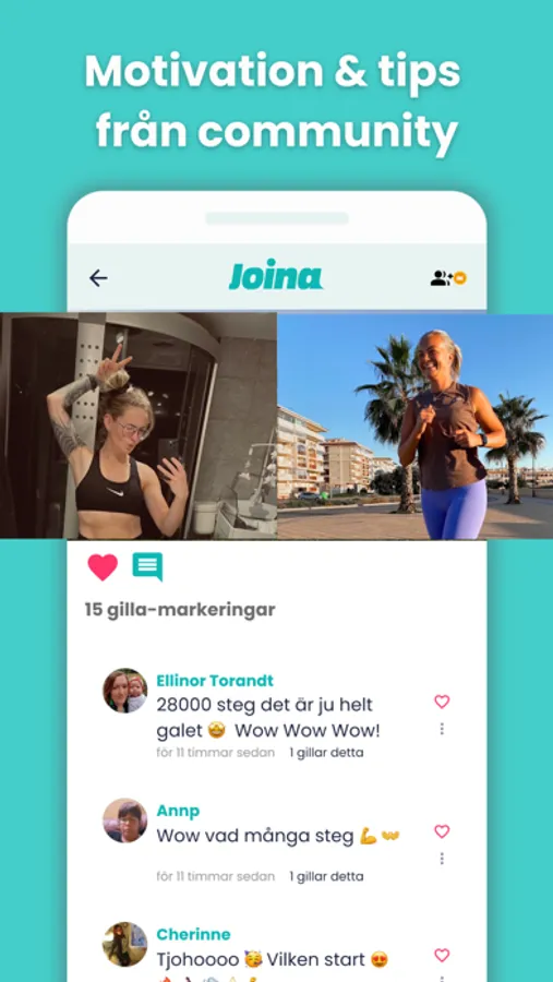 • Joina communityn – Ta del av flödet från alla andra som deltar. Joina handlar om att få och ge support till varandra. Ta del av tips, inspiration, stöd och peppa varandra mot målet.