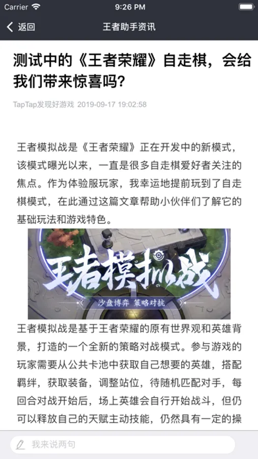 王者模拟战是基于王者荣耀的原有世界观和英雄背景,打造的一个全新的策略对战模式。参与游戏的玩家需要从公共卡池中获取自己想要的英雄,搭配羁绊,获取装备,调整站位,待随机匹配对手,每回合对战开始后,场上英雄会自行开始战斗,但仍可以释放自己的天赋主动技能,仍然具有一定的操作空间。