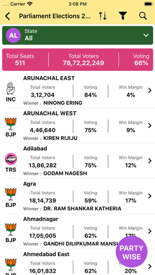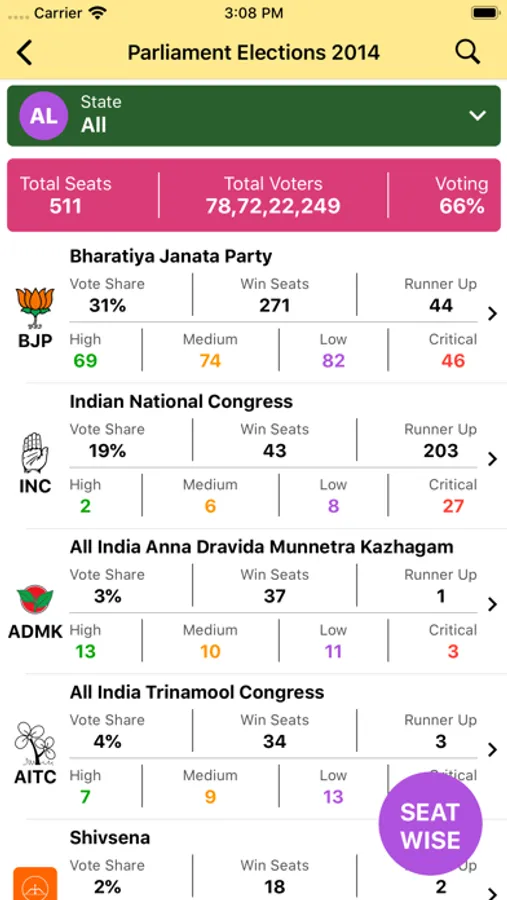 User can know vote share of each party like BJP, Congress, SP, BSP, NDA, JD(U), Shivsena, UPA, BJD, DMK, AIADMK, TMC, NCP, YSRCP, etc on each parliament seat, also vote share in each separate assembly constituency falling in the lok sabha seat. So one may decide, by giving vote to which party it may make big impact on final results.