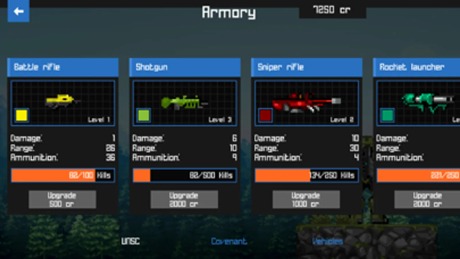 Collect and upgrade a variety of powerful weapons going from the Magnum to the Spartan Laser, level them up with your kills and collect unique skins for each weapon.