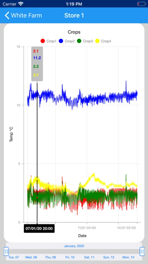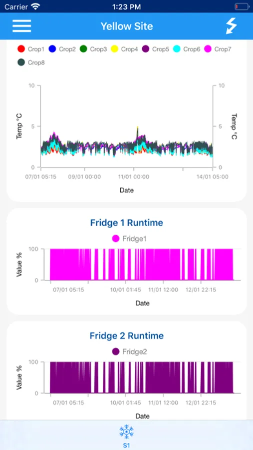 There are also three graphical charts showing up to 7 days worth of history of your store temperatures, crop temperatures (including all separate temperature sensors) and fridge run time. Choose your time period and switch on/off items from the legend to see an elegant chart customised to your requirements.