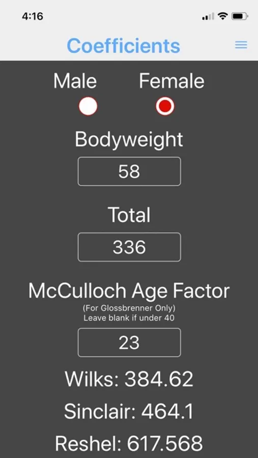 Calculate coefficients with IWF, IPF, Wilks or Glossbrenner plus Sinclair and Reshel legacy formulas.