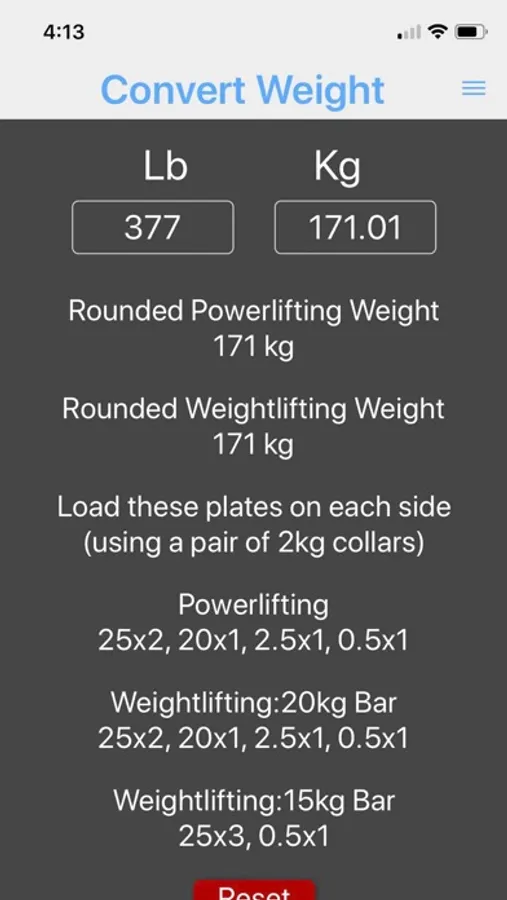 Weight conversion (lbs to kg) for competition weight attempts, including rounded values for valid attempts and plate loading data.