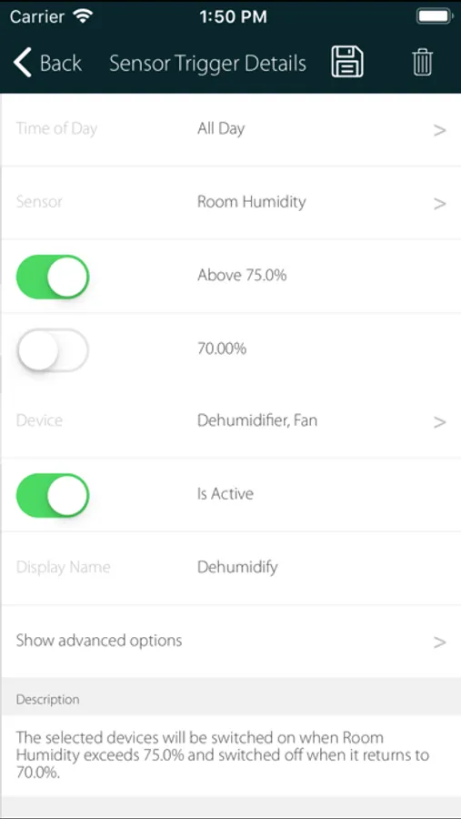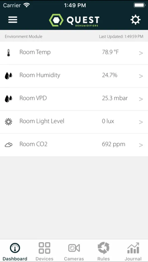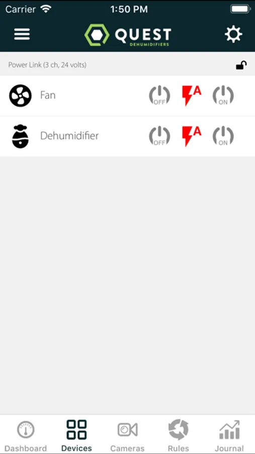 The Quest Cloud Control app works with supported Quest dehumidifiers. The app allows you to monitor sensor data in real-time and control any connected devices. You can set up rules including sensor triggers, timers, and schedules to automate the dehumidification process.