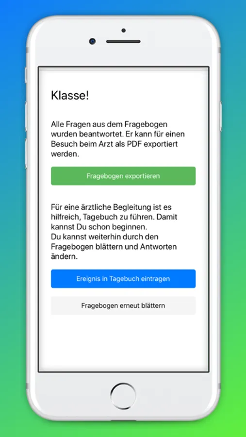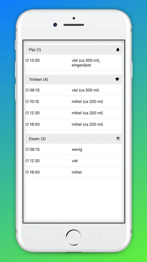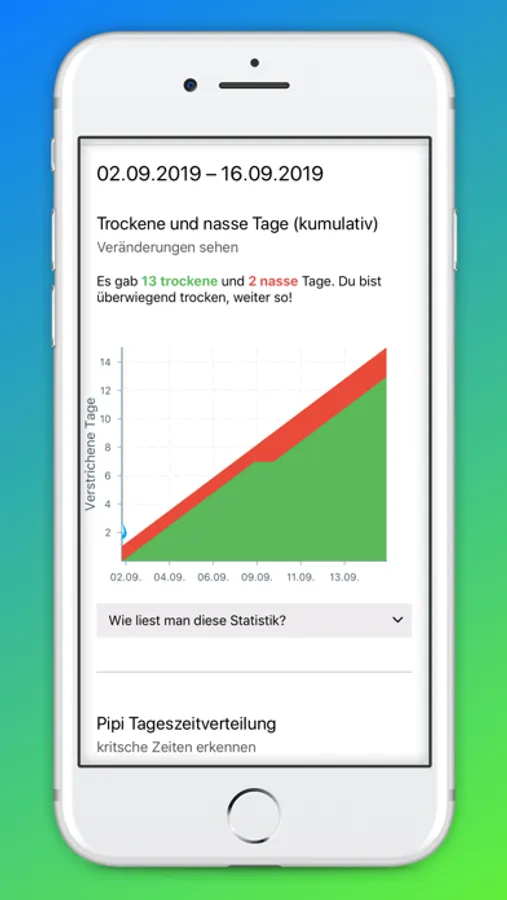 As a user of the free smartphone app for the Piesel Piepser, you will witness its further development. The app records a few basic data, provides a questionnaire with an export function for visiting the doctor and then accompanies the logging of urination, eating and drinking in a diary function. Helpful statistics can be read out over logged periods of time.
