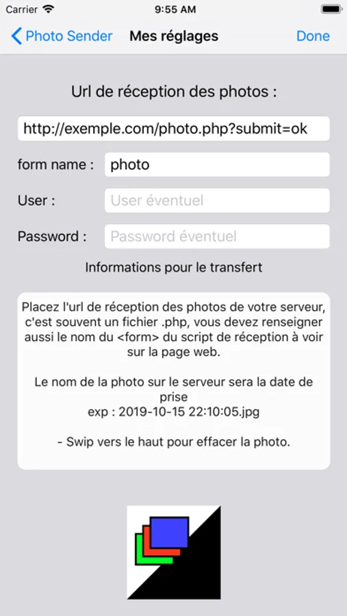 Quickly send photos to a classic web server with GPS and date information in EXIF. Perfect for setting up a personal photo consultation web service.