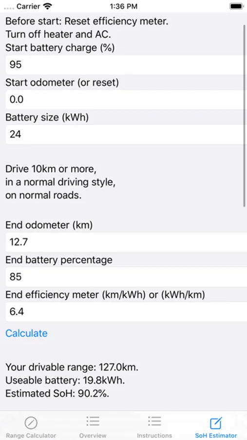 If you are considering buying a car, the app can make a buy or don't buy recommendation. Enter the battery size, amount of battery wear, your driving efficiency and expected driving speed. The app will tell you if the car will be able to drive the distance you plan, and warn you if the range is marginal or short.
