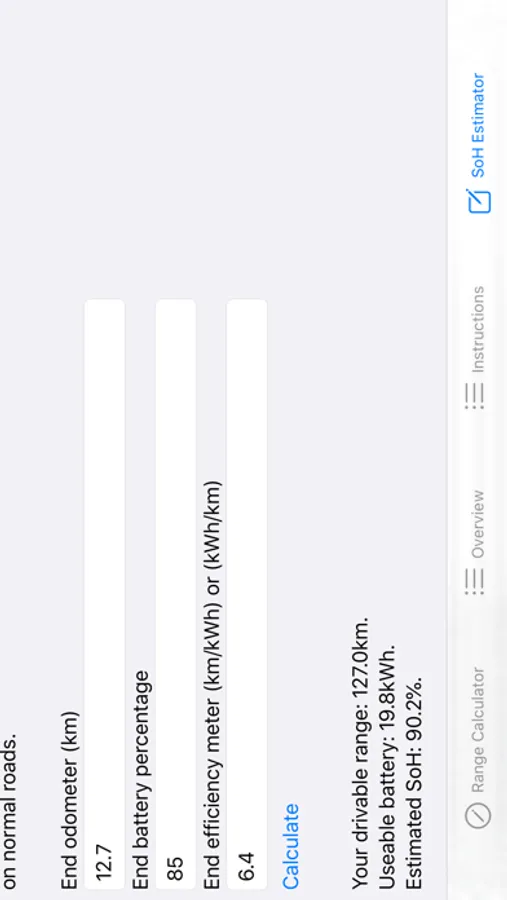 New Feature: This app can calculate the approximate SoH (Battery State of Health, or battery wear level), when you take a test drive, or while you make your daily commute. SoH is express as a percentage of the original (new vehicle) battery capacity.