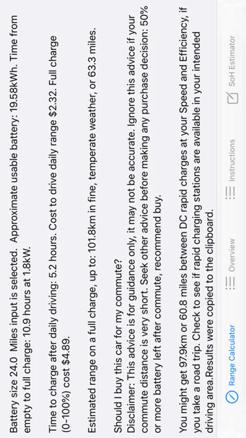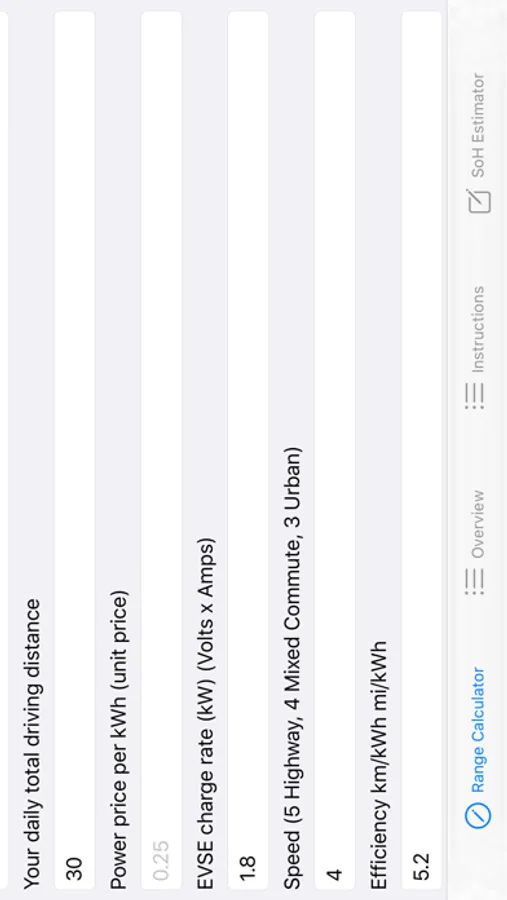 This App will calculate the practical distance between fast charging stops if you take a road trip, rather than using the car for daily commuting.