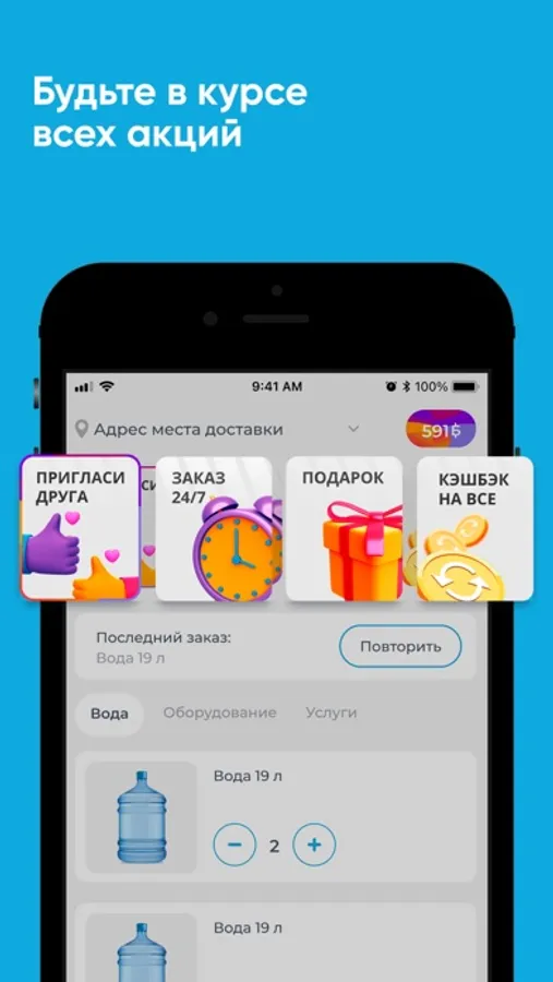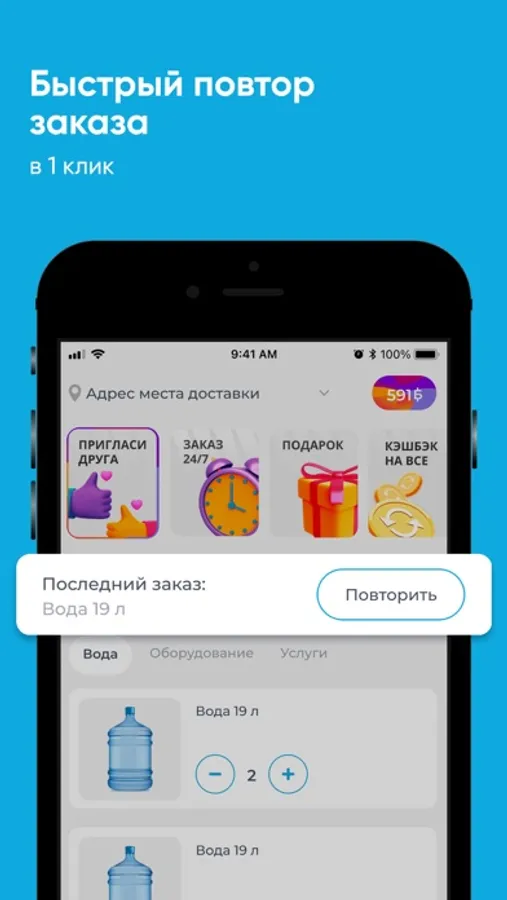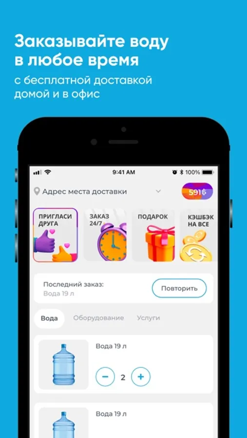 Скачайте бесплатное приложение на телефон и заказывайте чистую воду в удобное время!
