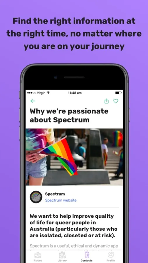 Spectrum is a queer wellness app, here to arm queer people who are isolated, closeted or at-risk with the tools to manage their mental health, find resources and information and connect with the community.