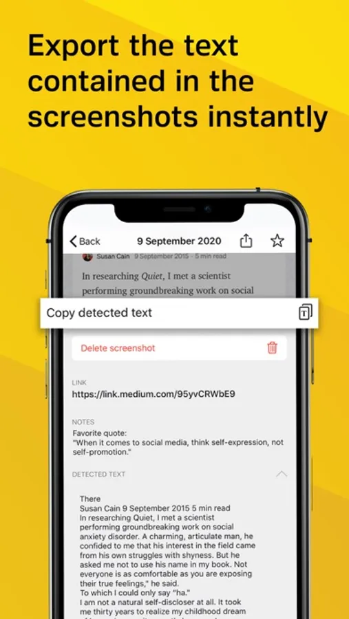 - Export the text contained in all the screenshots: from today you can easily export the text contained in your screenshots to send it to whomever you want by simply copying it and pasting it on Whatsapp, Mail or any other application (works only for Latin languages)