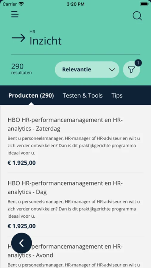Je krijgt suggesties op basis van jouw profiel en werkgever. Kies één van de suggesties en verfijn je resultaten met de filters.