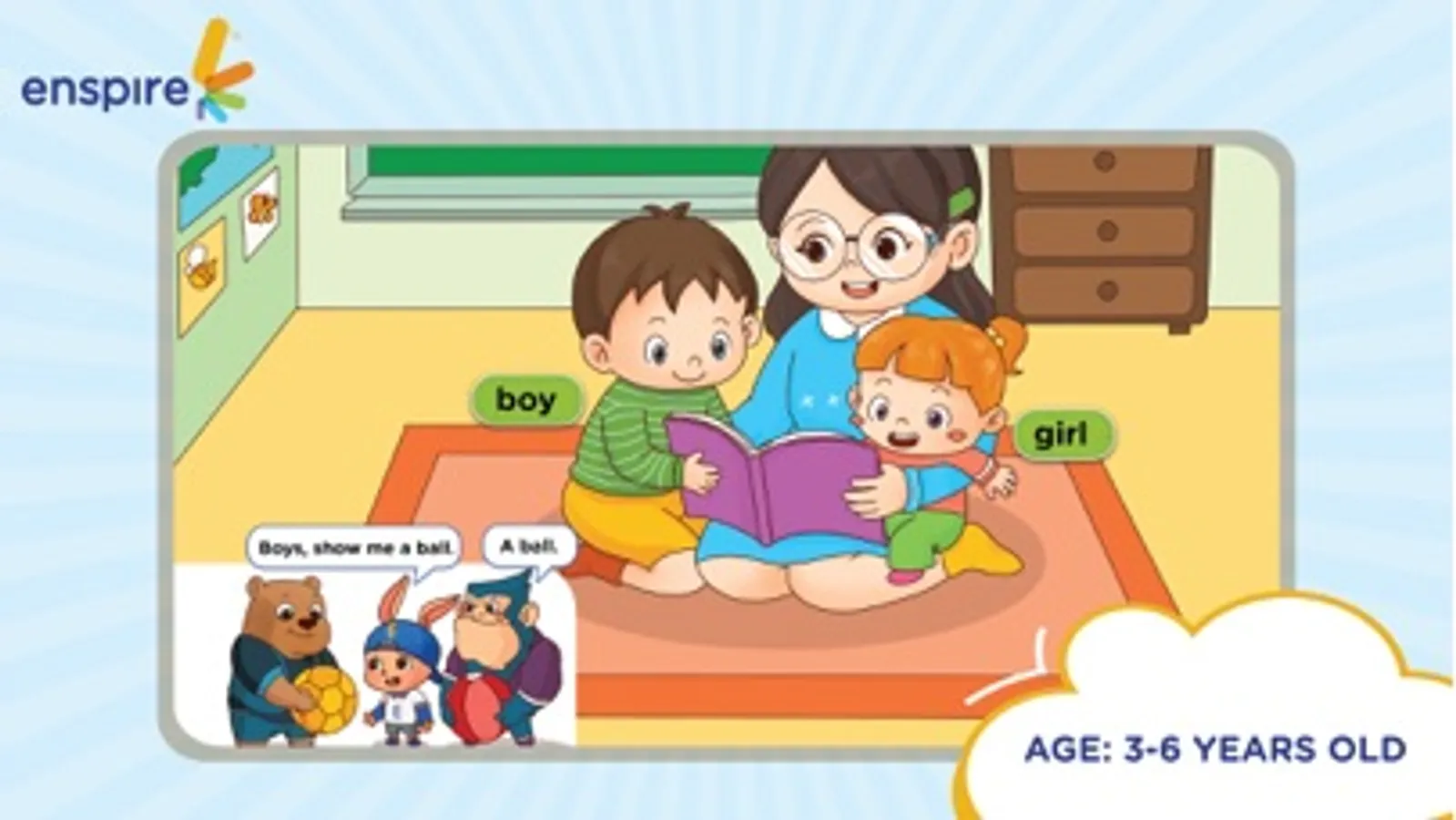 Enspire Start is a system of electronic English books for preschool children (3-6 years old) which provide a natural and fun experience to become familiar with English. Through Enspire Start, children are focused on developing English language and skills such as vocabulary, pronunciation and conversations around familiar topics.