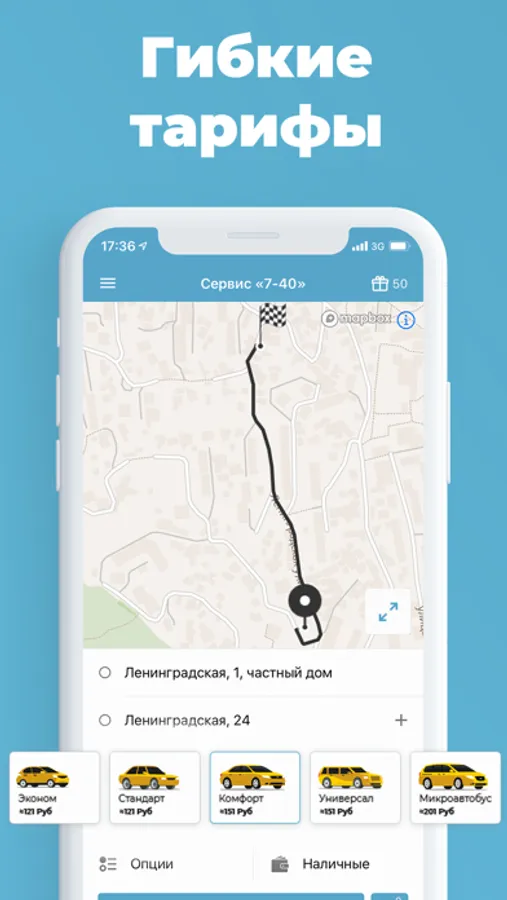 Перед заказом такси Вы выбираете тариф. В приложении доступно 6 тарифов: