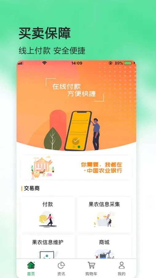 相宇惠农是专门为果农、果商提供信息采集、在线绑卡、商品买卖、果品收购、在线支付等综合性果品交易平台。通过设立惠农服务站,服务站人员负责采集从事果品种植,果品收购,果品储存的人员进行账户注册,信息采集,绑定农行卡。惠农服务站通过APP为果农提供农资、化肥、种子等代购服务、通过农行借记卡进行资金结算。果商通过交易商app在线收果,通过农业银行支付接口与果农之间进行资金划拨及资金结算,实现市场无现金化交易,减少果农损失,规避交易风险,确保资金安全。