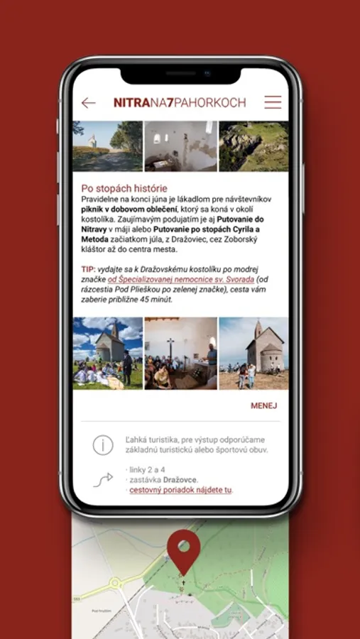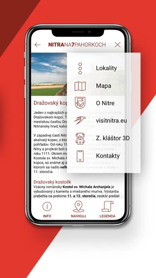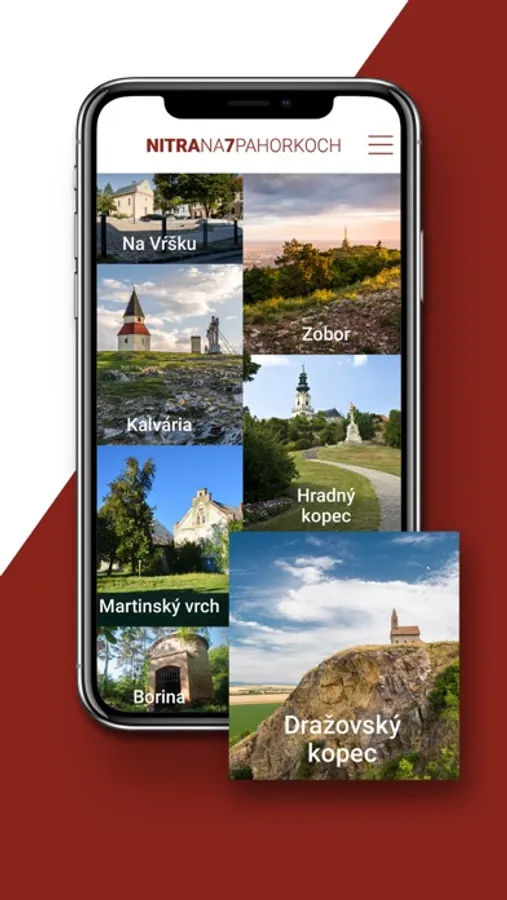 Nitra na 7 pahorkoch je mobilná aplikácia, ktorá vás pútavým spôsobom prevedie po siedmych kopcoch, na ktorých stojí mesto pod Zoborom. Spoznáte jednotlivé lokality, dozviete sa praktické informácie ohľadom dostupnosti a dopravy a prečítate si legendárne príbehy z dávnych čias. Aplikácia vám lokality sprostredkuje aj vďaka množstvu fotografií a pomôže tiež s navigáciou ku každému pahorku. S technológiou rozšírenej reality si môžete prezrieť stratenú podobu Zoborského kláštora.