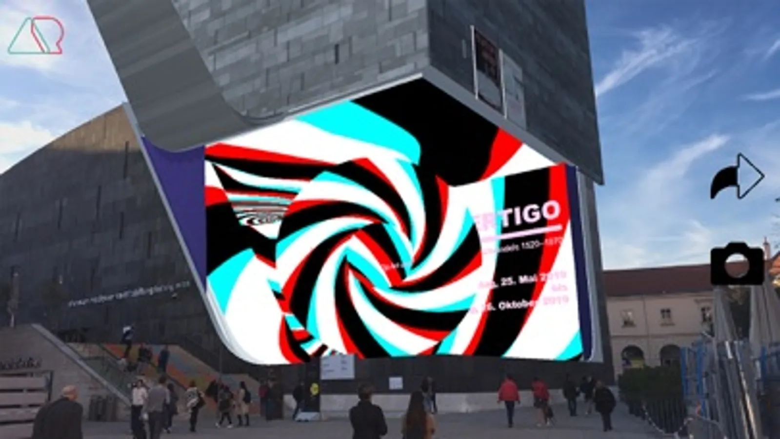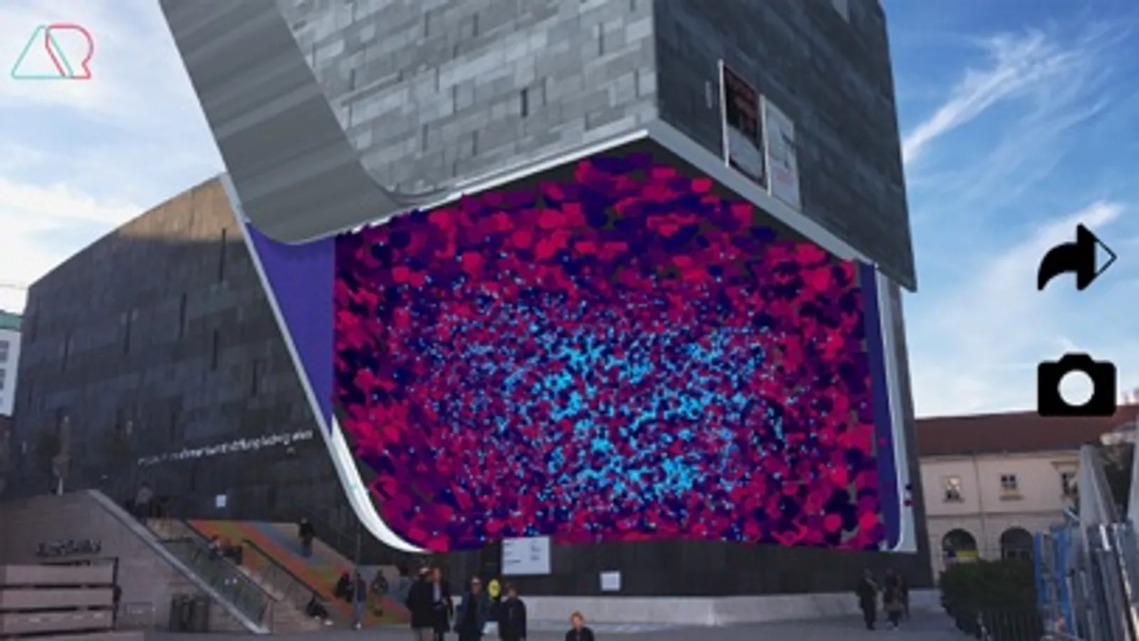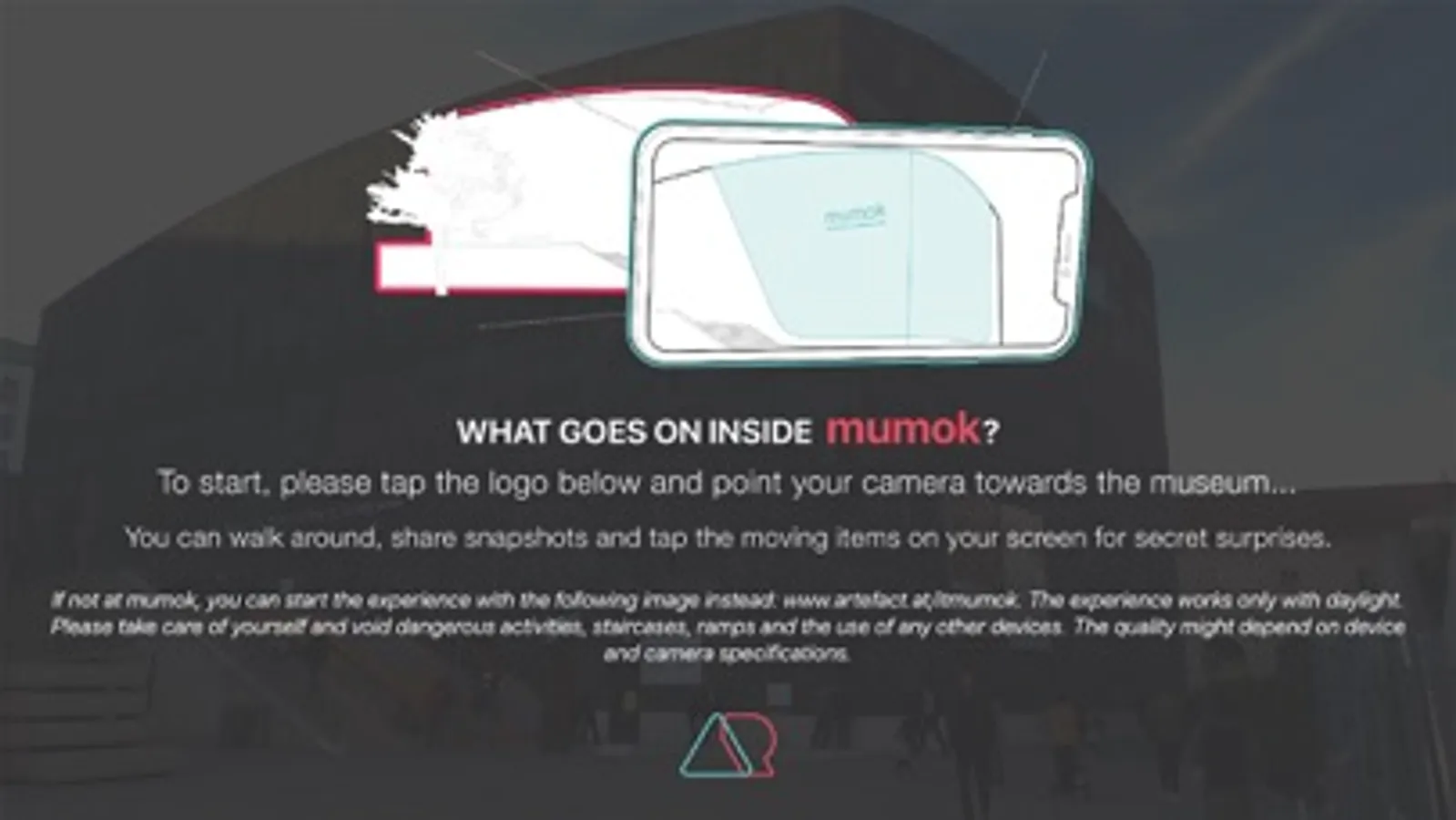 mumokAR is a mixed reality app that lets users experience and interact with the transformation of the main museum building. During this process the building transforms into a gigantic urban stage. Several sequences playfully reveal museum related content and information regarding existing and upcoming exhibitions. Interaction through tapping on moving objects further reveals surprises to the users.
