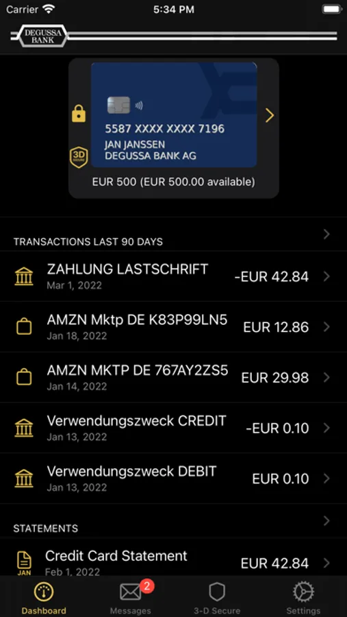 • You can see your cards and recent transactions and statements on the dashboard.