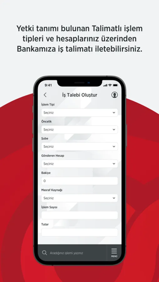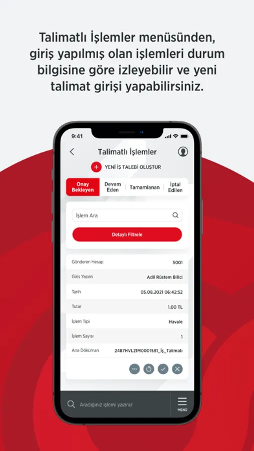 - Talimatlı işlemler menüsünden EFT, Havale, Fatura, Vergi ve SGK gibi işlemlerinizi kolayca yapabilir, talimatlarınızı takip edebilir, temsilciniz ile anlık mesajlaşabilir, işlemlerinizin dekontunu izleyebilirsiniz. Talimatları yetkinize göre onaylayabilir, reddedebilir ve iptal edebilirsiniz.