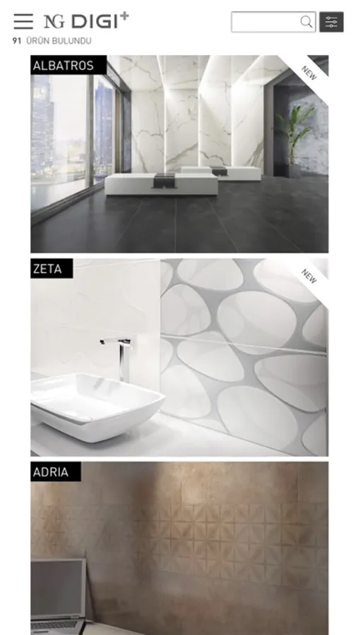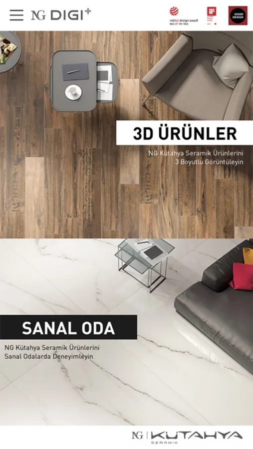 NG Kütahya Seramik, NG Digi+ uygulamasıyla kullanıcılarına farklı bir kartela ve sanal showroom deneyimi sunuyor. NG Kütahya Seramik, dijital platformda 3D görüntüleme teknolojisiyle ürünlerini simule ederek , renk, desen ve doku özelliklerini deneyimleme fırsatı sunuyor.