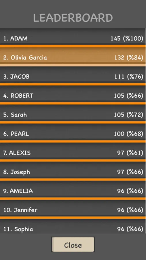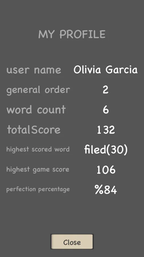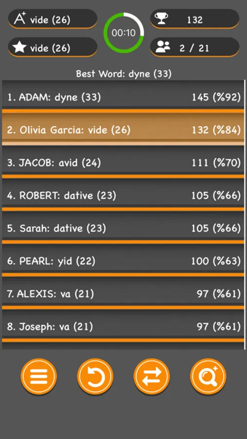 You can see your stats on My Profile page and general scores on Leaderboard page. You can change game's dictionary from settings page to play in different languages.