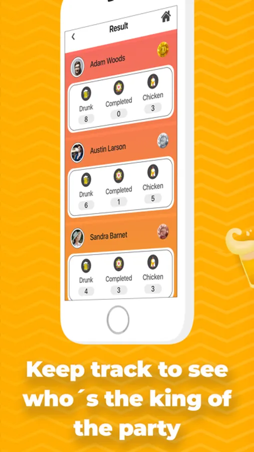 • Receive fun task for all players, and mark who complete the challenges and who bail out.