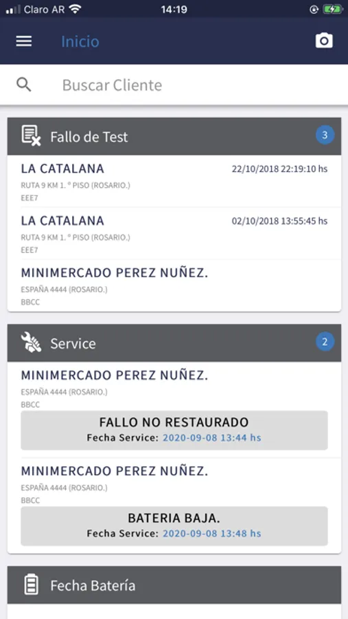 Es un tablero o panel principal que permite una rápida visualización de la información y ofrece la posibilidad de una búsqueda rápida a través del nombre, dirección o número de la cuenta. En el tablero se encuentran los recordatorios de fallos de test, fechas de baterías, services, cuentas en test y notificaciones.