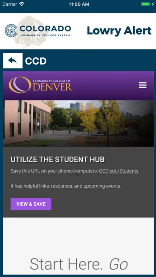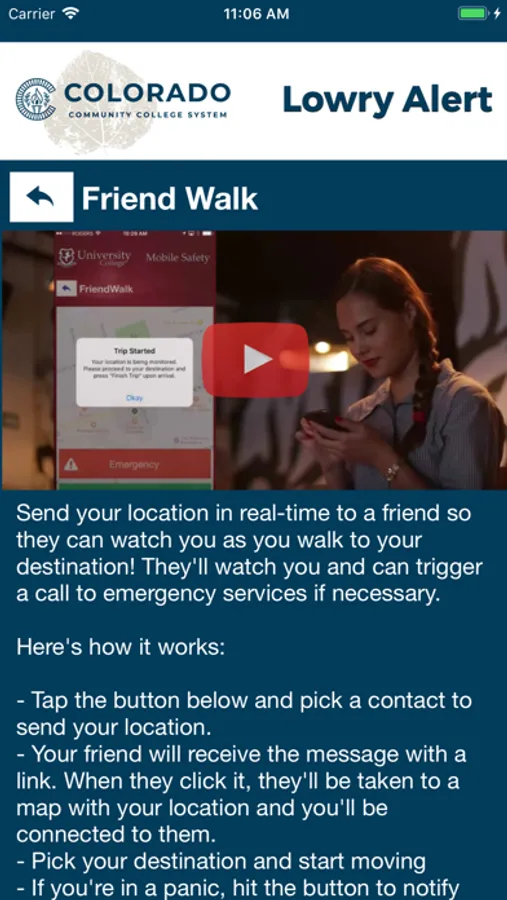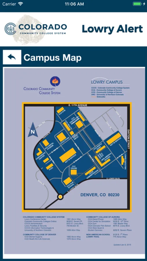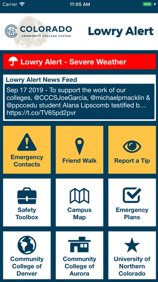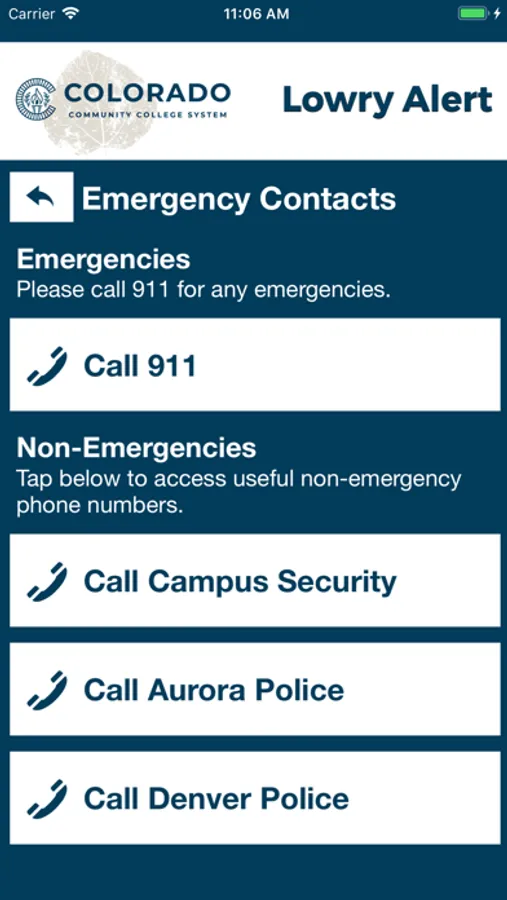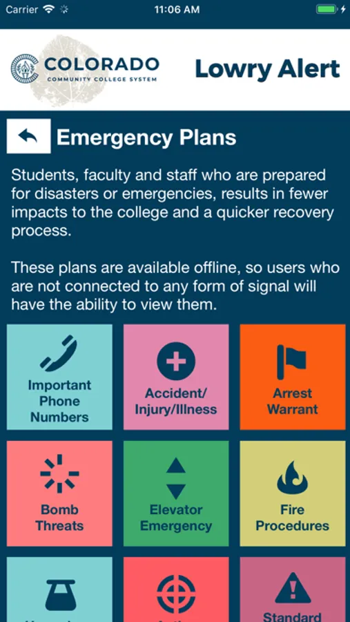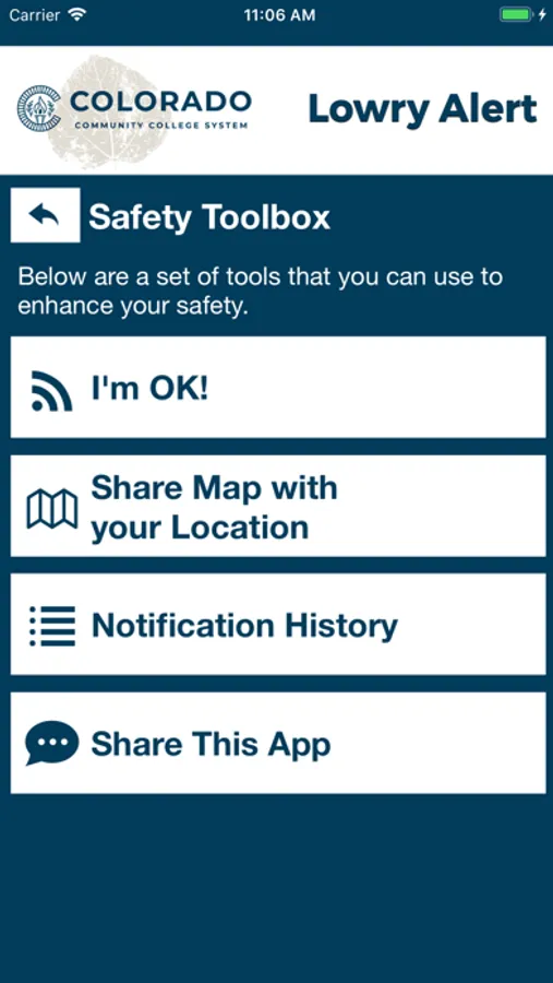 Lowry Alert is the official safety app of Colorado Community College System - Lowry Campus. It is the only app that integrates with CCCS Lowry's safety and security systems. Campus Security has worked to develop a unique app that provides students, faculty and staff with added safety on the CCCS Lowry campus. The app will send you important safety alerts and provide instant access to campus safety resources.