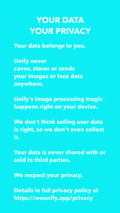 We harness Apple's first-class Vision AI (which is built into iOS), along with Unify's Visual Mesh technology. Faces are detected right on your device and your images stay secure on your iPhone. While we can detect a face (most of the time), we can't tell who it is or anything else. All we can determine is where that face is within that picture.