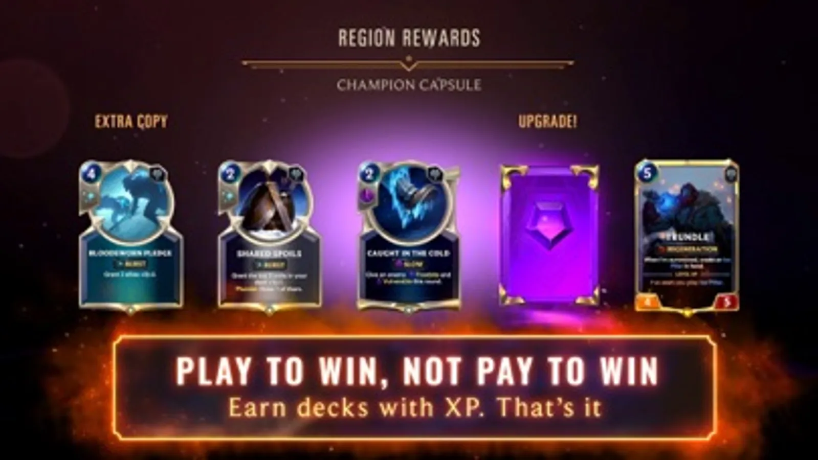 Earn cards for free, or buy exactly what you want with shards and wildcards—you’re in control of your collection, and you’ll never pay for random packs of cards. While there’s always the option to purchase specific champions, you can easily complete your collection without spending a cent.