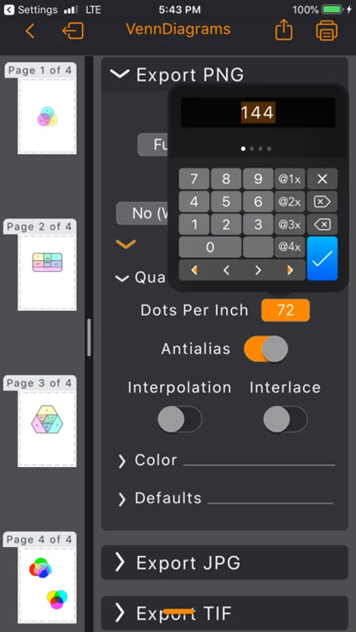 Export formats include: PDF, PNG JPG, and TIF. Export directly to photos and albums.