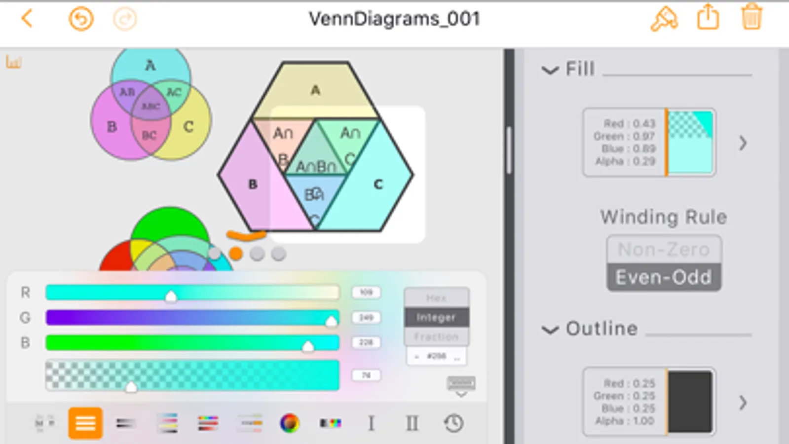 EazyDraw is fully color managed and supports both sRGB and P3 wide gamut colors. Eight full featured color pickers provide unparalleled color inspection and selection. The color wheel inspector automatically generates a complimentary palette of 20 colors.